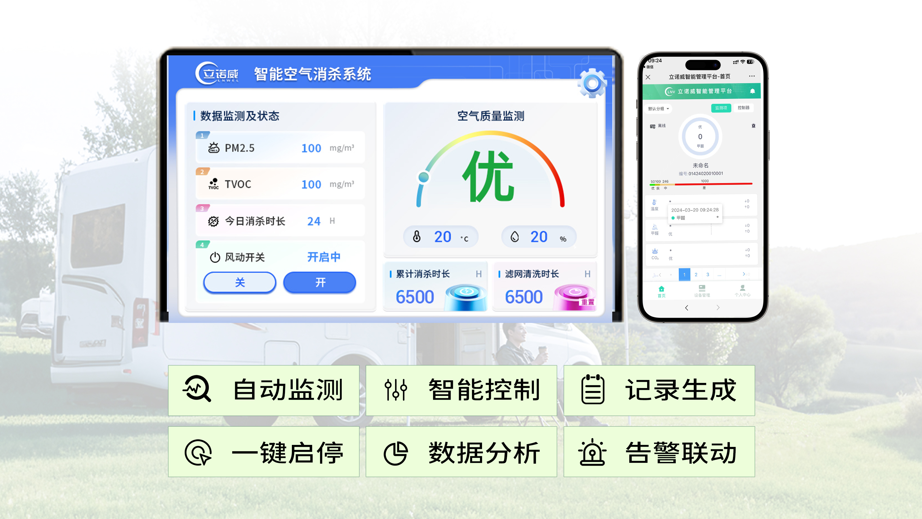 区别于市场的净化产品,我们的解决方案并非简单的“空气净化器植入”,而是“实时监测+净化消毒+负氧离子供氧+云端管理”一体化解决方案,实现了净化消毒与健康赋能。此外立足房车特色,采用模块集成化设计,不占用宝贵室内空间;支持车载电源,运行噪声低,夜间使用无干扰。