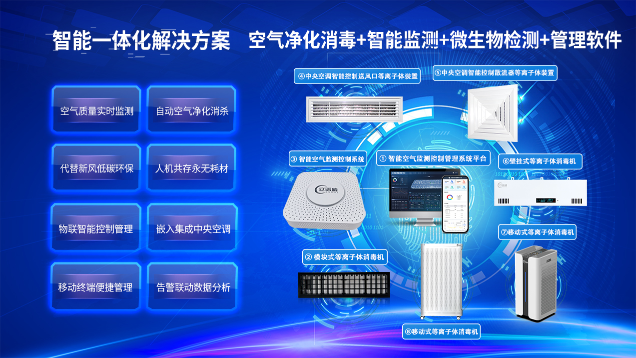 空气质量实时监测 / 自动空气净化消杀 / 物联智能控制管理 / 嵌入集成中央空调