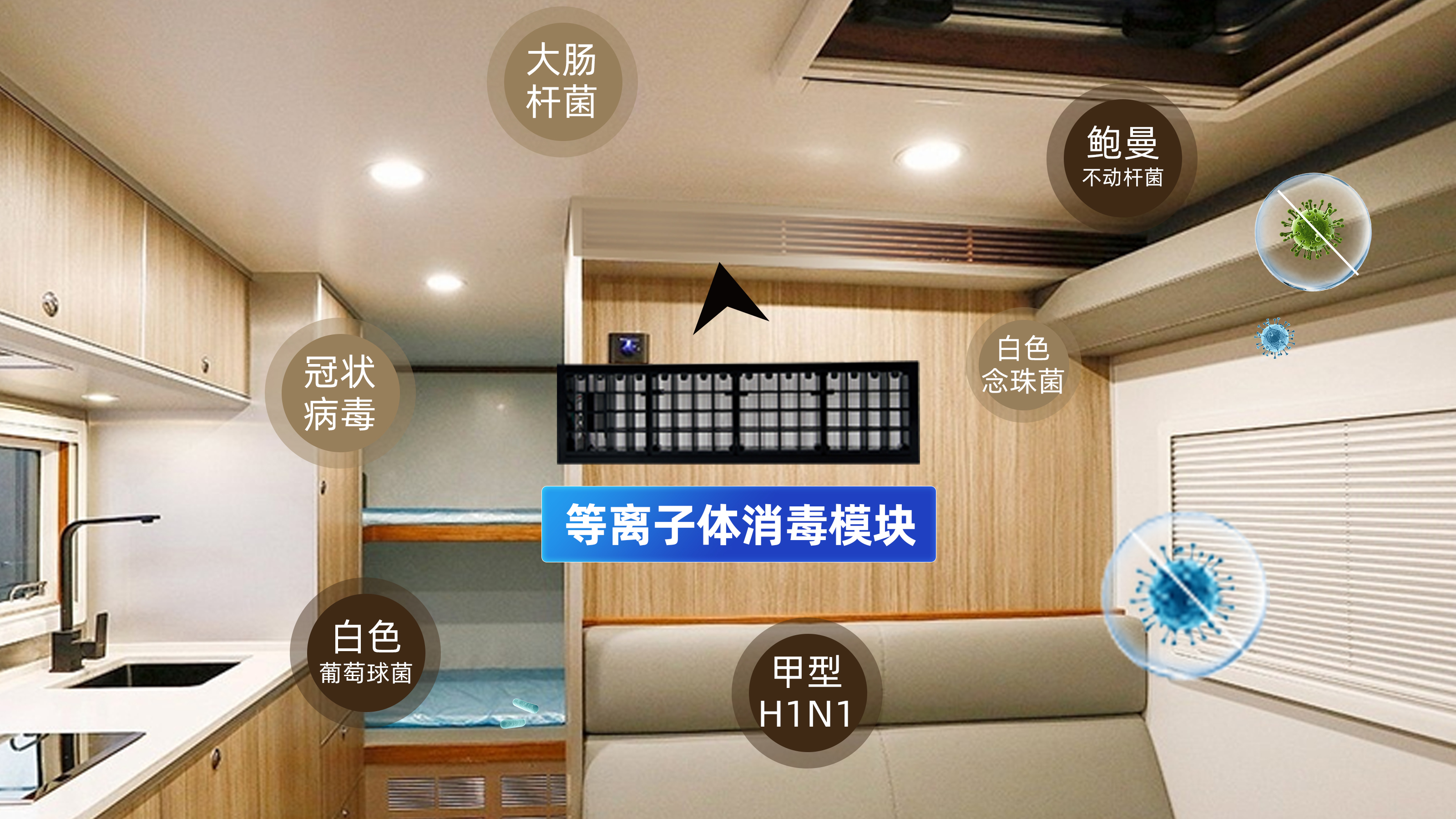 这是破解房车“异味重、新车不敢住”的核心技术——采用等离子体净化消毒技术,快速分解车内甲醛、TVOC等有害气体,改善内饰异味、油烟味、霉味等异味,灭杀细菌病毒。新车无需长时间放置,让用户提车即住、出行即享清新空气。